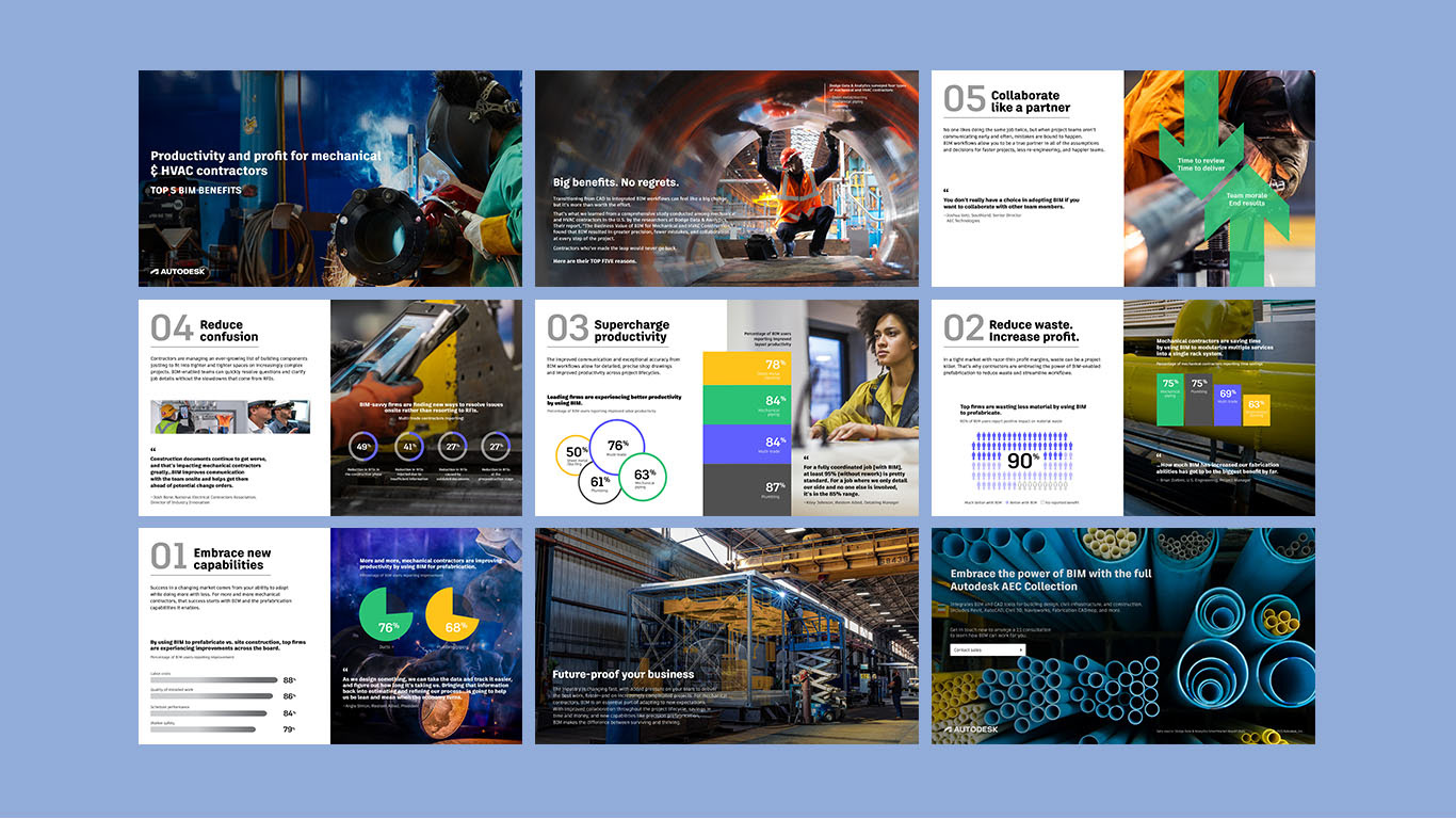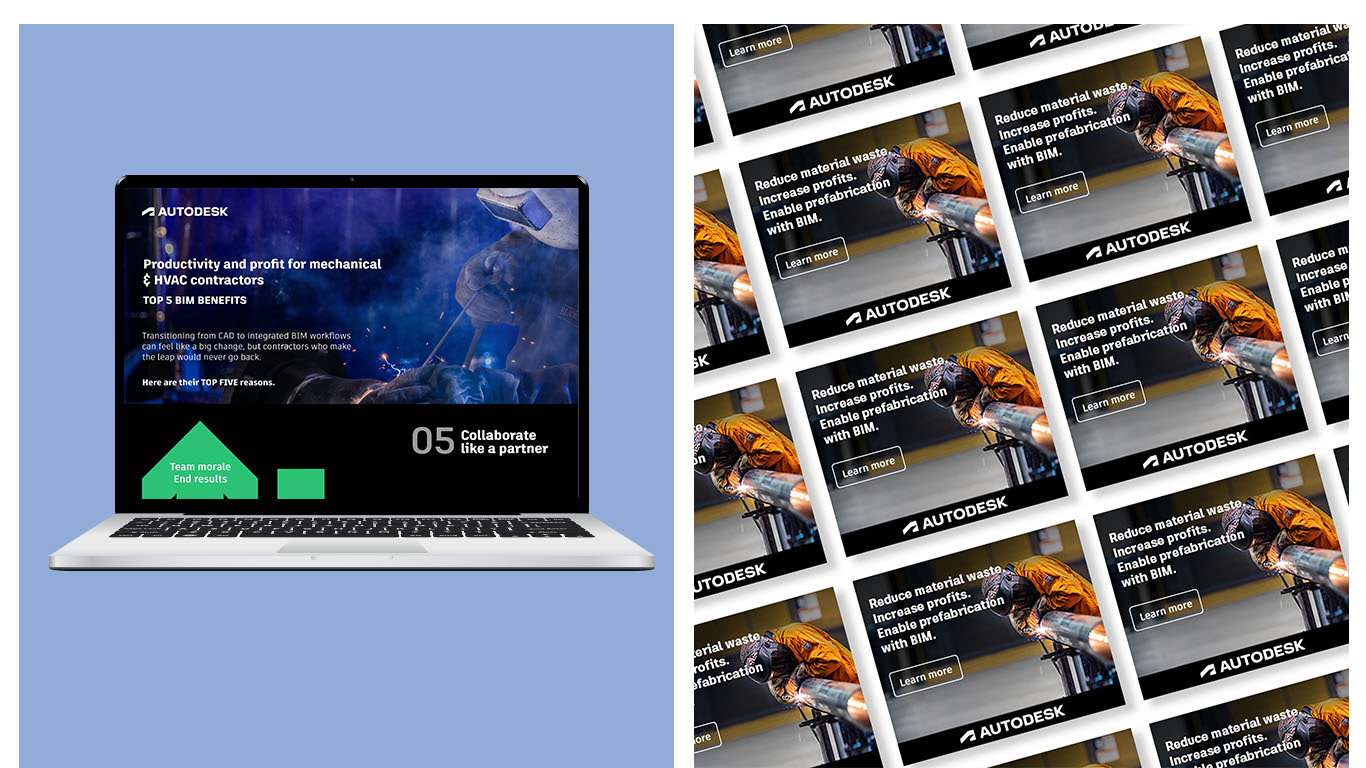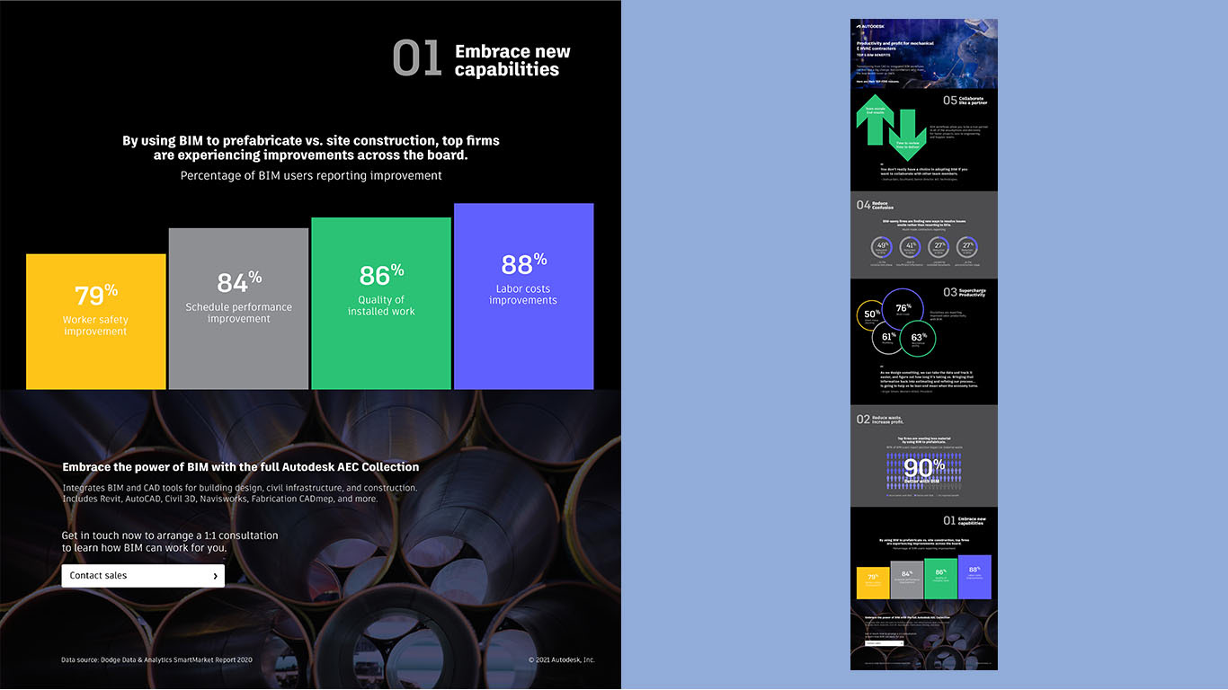 A demand-generation campaign tailored to mechanical and HVAC contractors, focused on driving awareness and engagement with Autodesk’s BIM 360 software. This top-of-funnel initiative leveraged compelling, data-driven content to turn contractors into long-term partners. In addition to designing the full layout, I created the charts and data visualizations, ensuring the campaign’s insights were not only clear and digestible, but visually cohesive with the broader brand system. The result was a clean, informative user experience that paired storytelling with strategic design to educate and convert.